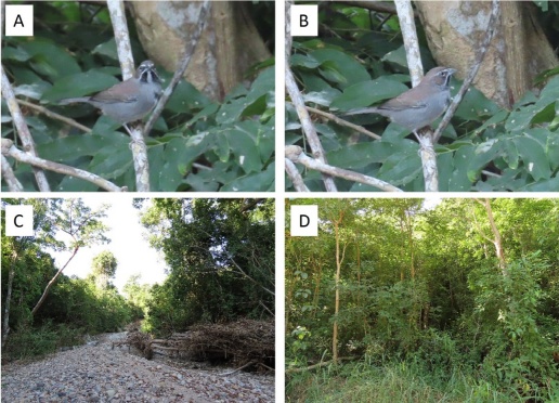Figura 1 A-B) Fotografías tomada de del Zacatonero Cinco Rayas (Amphispizopsis quinquestriata). Fotografías por Juan Carlos Pérez Magaña el 20 de noviembre de 2020. C-D) Sitio donde se fotografío en selva mediana subperennifolia en los márgenes del Arroyo Cajones en el Rancho Don Andrés, aledaño a la Reserva de la Biosfera Chamela-Cuixmala. Fotografías por Alberto González Gallina 20 de noviembre de 2020.