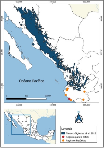 Figura 2 Mapa de distribución del Zacatonero Cinco Rayas (Amphispizopsis quinquestriata) según Navarro-Sigüenza et al. 2018 (azul oscuro), con registros fuera del área de distribución en el estado de Jalisco (círculos naranjas) y el registro del presente estudio en la Reserva de la Biosfera Chamela-Cuixmala (diamante rojo).