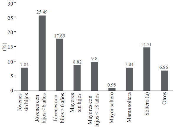Three demographic groups stand out, young families with children under six (25.5%), younh families with children over six (17.7%) and single (as) (14.7%), with smaller percentages in other groups (Figure 1).