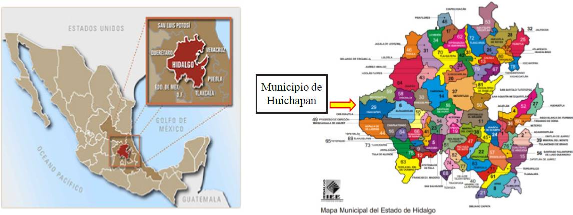 The research was conducted in the municipality of Huichapan, Hidalgo, Mexico. This is located to the west in the state of Hidalgo, bordered on the north by the municipality of Tecozautla, south to the town of nopala and Chapantongo, the west with the state of Queretaro and east with the municipality of Alfajayucan (Table 3). It has an area of 668.1 km, representing 3.2% of the state surface. It is a territory located in an area of the plains, with irregularities of the land where a mountainous region is observed. It has a temperate-cold climate. It consists of 67 communities, of which only 3 are considered urban and 44 of them have primary school belonging to the Ministry of Public Education (SEP). It has a total population of 44 253 inhabitants, of which 21 176 are men and 23 077 are women (INEGI, 2010).