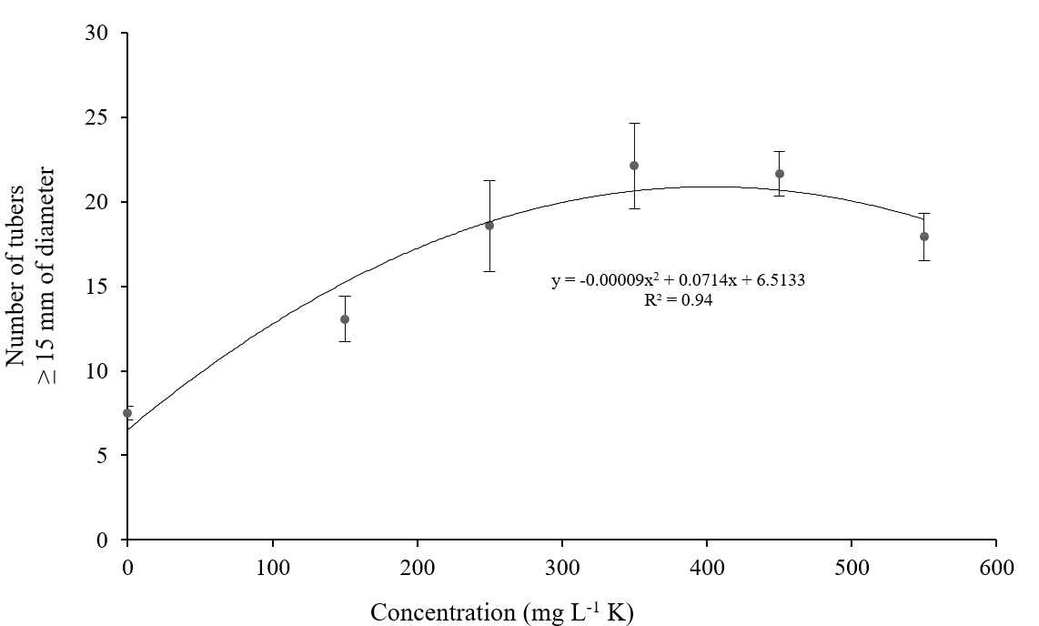 Tubers equal or greater than 15 mm in diameter. Regarding the number of tubers ≥ 15 mm in diameter, treatments 250, 450 and 550 mg L-1 of K produced 18.6, 21.7 and 17.9 per plant, respectively and were statistically equal; whereas treatment with 350 mg L-1 of K yielded significantly more tubers (22.1) than the commercial control with 18.6 tubers per plant. Treatments of 0 and 150 mg L-1 of K produced 7.5 and 13.1 tubers, respectively (Table 2).