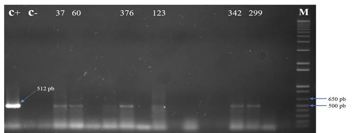 The electrophoresis was performed on a 1% agarose gel with TAE 1 X buffer and 12.5 μL of the PCR products were loaded, the samples were run with a voltage of 120 V. Finally, the gels were stained with BrEt and visualized in a transilluminator with UV light (UVP) for the analysis of results. In order to have a positive control for the detection of the virus, the PCR product of 512 bp corresponding to a sample from a locality of Tecoman, Colima was purified from the agarose gel with the kit ‘QIAquick Gel Extraction’ (QIAGEN).
