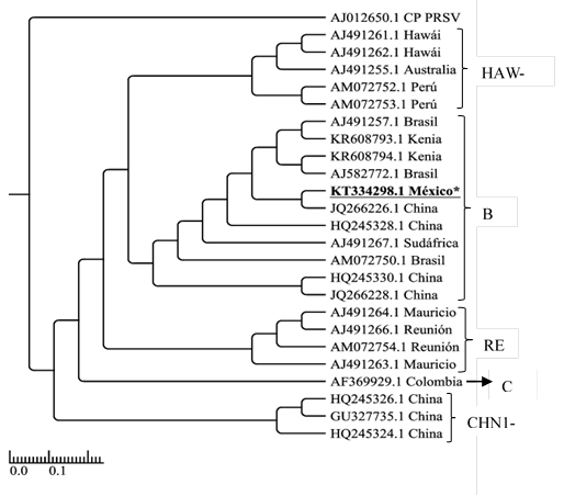 Figure 3 Phylogenetic tree based on the UPGMA method and maximum likelihood using partial sequences and complete genomes of SCYLV. The CP sequence of the PRSV (Papaya ringspot virus) was used as an external group and bootstrap analysis was performed with 1000 replicas. The Mexican isolate of this study is highlighted with an asterisk. Genotypes HAW-PER= Hawaii-Peru, BRA= Brazil, REU= Reunion, COL= Colombia and CHN= China.