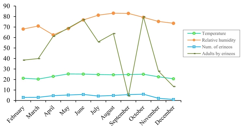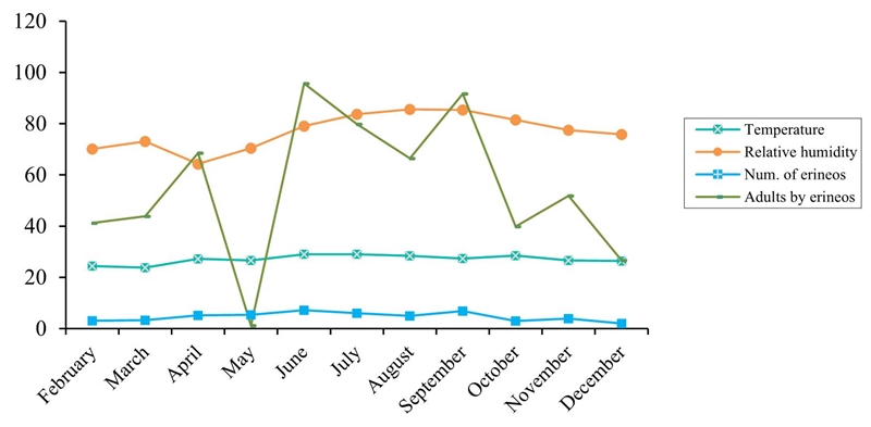 An analysis of the Pearson correlation coefficient (SAS Institute, 2004) was performed for the variables number of erineos per leaf and number of adults by erineos, this with the purpose of knowing how they are affected by climatic factors (Hernández-Zaragoza et al., 2017).