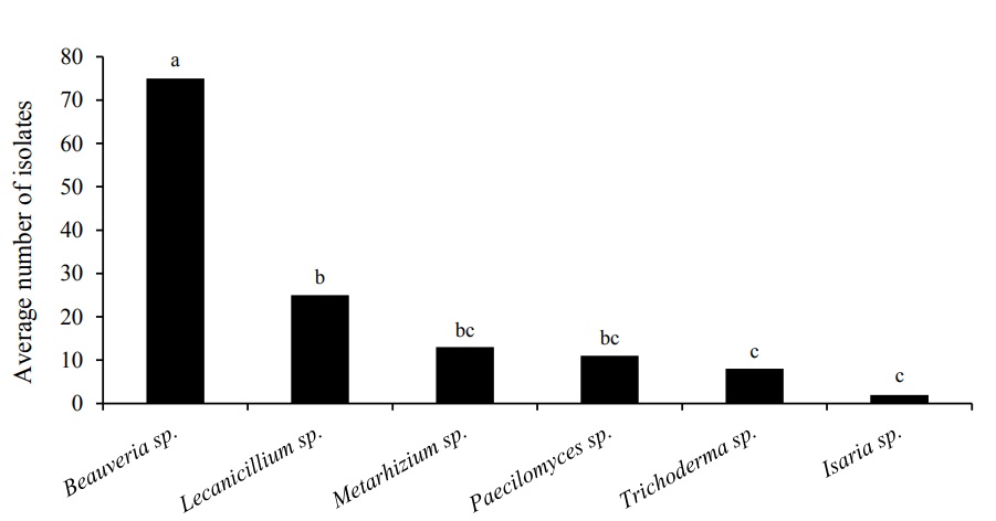 In the localities and environments sampled, six genera of entomopathogenic fungi were collected. Of which, the abundance of these was different (P-value: 0.01). Of the fungi collected, Beauveria sp., showed the highest abundance followed by Lecanicillium sp., Metarhizium sp., Paecilomyces sp., Trichoderma sp. and Isaria sp. (Figure 2).