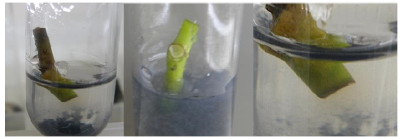 Figure 2 Oxidation of explants. Left: outbreak presenting oxidation; center: outbreak that is considered viable; right: phenolic compounds released into the culture medium.