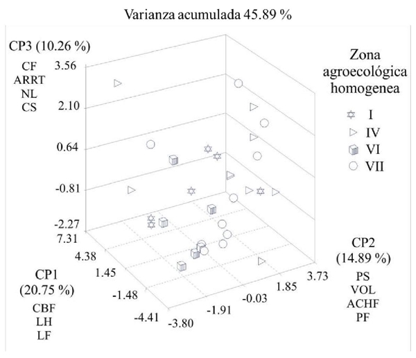In the Figure 1 shows the distribution of 31 cultivated varieties from four homogenous agro-ecological zones based on three main components. When analyzing the eigenvectors with values above 0.3, it is determined that the CP1 is a function of the presence of the neck at the base of the fruit (CBF), leaf length (LH) and fruit length (LF), the CP2 is determined according to the weight of the seed (PS), fruit volume (VOL), width (ACHF) and fruit weight (FP), finally, CP3 is a function of fruit color (CF), transverse wrinkling (ARRT) ), number of locules (NL) and seed color (CS).