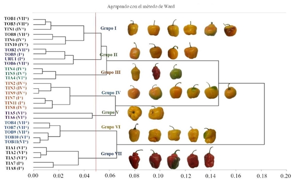 In the dendogram generated from the cluster analysis, groups of cultivated varieties from the same locality were identified, as well as the association of varieties cultivated by the agroecological zone of the place of origin (Figure 2). In the germplasm collected there is a wide variability, these differences may be related to the places of origin. It has been identified that the temperature and the quantity of water available during the growth and reproduction of the plants are important factors for the differentiation of the populations of wild chili that grows in natural conditions (Hernández-Verdugo et al., 2012).