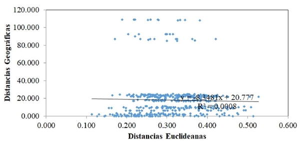 Figure 3 Mantel test, linear correlation between distribution of 31 cultivated varieties of C. pubescens based on Euclidean distances generated by morphological characteristics and geographical distribution according to the geographic coordinates of origin.