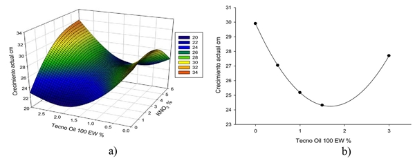 Figure 1 Influence of the response curves that show the interactions for the current growth variable; a) interaction of Tecno Oil 100 EW and KNO3, and b) quadratic response of Tecno Oil 100 EW in current growth.