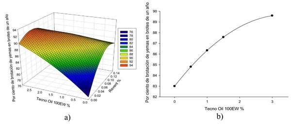 Figure 2 Influence of the response curves that show the interactions for the bud budding variable of one year; a) interaction of Tecno oil 100 EW and Revent; and b) quadratic response of Tecno Oil 100 EW in one-year sprouting.