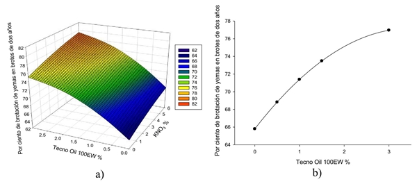 In Figure 2a, the interaction between Tecno Oil 100 EW and Revent is observed with a one-year increase in budding of 92%, presenting a synergistic effect with different mode of action, on the permeability of the bud scales. Also, in Figure 2b Tecno oil 100 EW presents a quadratic response where the maximum point was 90% with a 3% application of Tecno oil. These data agree with Campoy et al. (2010) who mention that the application with thidiazuron and winter oil managed to flourish significantly earlier and more uniformly.