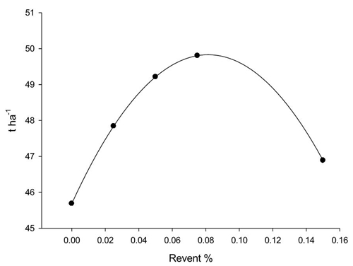 In relation to the results obtained in Production, Figure 4a shows the quadratic response where an optimum is achieved with the range explored for Revent with the highest production (49.5 t ha-1) when using 800 milliliters per 1 000 L water, point where an inflection was recorded from which the yield decreased; it is worth mentioning that when the dose exceeded the inflection point, a type of rosette of the leaves was observed without these being able to extend completely, likewise, the flower petals did not open completely (precisely the appearance of rose flowers) and in harvest the fruit presented a larger than normal opening in the calyx area with an atypical appearance for this variety.