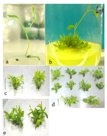 Figure 1 In vitro propagation of capers in a semi-solid medium. a) seedling obtained from seed disinfected and germinated in vitro; b) response observed at 90 d in a nodal segment cultured in medium with 2 mg L -1 of MT. Note the presence of a well differentiated sprout and a mass of poorly differentiated sprouts at the base; c) response to the 54 d of incubation of nodal segments exposed to BA; d) at 2iP; and e) to MT. Bar= 1 cm.