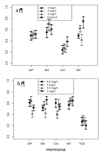 Regarding the numerical analysis of the results, Figure 2 shows the graphs obtained with the R software (ver. 3.2.3), which handles a relative scale (without units) from 0 to 1 and shows the effect of each of the growth regulators tested with their respective concentrations. The statistical analysis shows that there are differences between the different treatments based on an ANOVA-TypeStatisc (ATS) with a value α= 0.05. For the experiment only with cytokinins (Figure 2a) the p values of 3.48 e-14, 8.69 e-03 and 1.08 e-09 are obtained, for the effect of cytokinin, concentration and cytokinin: concentration interaction, respectively. In the experiment where cytokinins are combined with ANA (Figure 2b), the p-value for cytokinin is 1.71 e-10, for the concentration it is 5.64 e-09 and for the interaction cytokinin: concentration is 1.59 e-05.