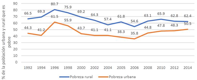 Mexico has had a deficit trade balance of agricultural products and high levels of poverty, especially in the peasant sector. In Mexico, approximately 62% and 50% of the rural and urban population is poor. This shows that after more than 20 years dedicated to combating poverty, more than half of the urban and rural population remains poor (Figure 3).