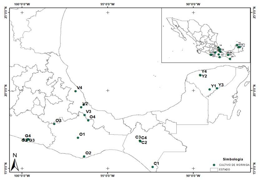 The research focused on the south-southeastern region of Mexico due to the presence of commercial cultivations of moringa and this characteristic favored seed availability. The seeds of the accessions studied are from the states of Veracruz, Oaxaca, Guerrero, Chiapas and Yucatán (Table 1, Figure 1). The research was carried out at the College of Postgraduates, Campus Veracruz, geographically located at 19° 16’ 32” north latitude, 96° 16’ 32” west longitude, at an altitude of 16 m (Valdés et al., 2014). The climate is warm subhumid (AW0), with an accumulated annual rainfall of 1 000 mm and an average annual temperature of 27 °C (Olguín, 1999).