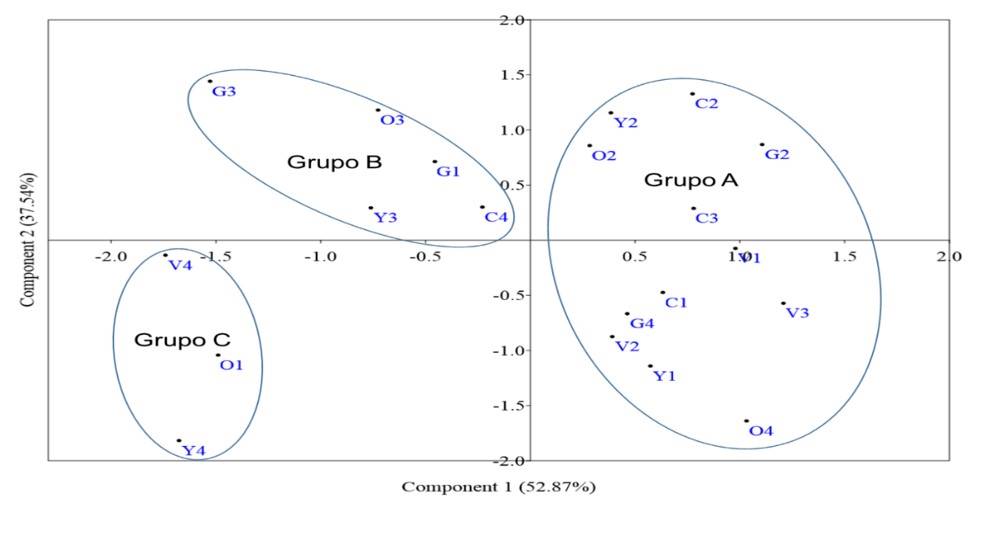 The two-dimensional Figure 3 of the analyses of principal components 1 and 2 shows 3 groups. Group A comprises accessions O2, Y2, C2, G2, C3, V2, G4, C1, V3, Y1, O4 and V1. Group B comprises accessions G3, O3, G1, Y3 and C4. In group C, populations V4, O1 and Y4 were identified (Figure 3). The grouping was the result of the PCA based on the analysis of morphological descriptors.