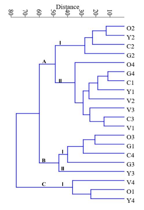 Two subgroups were formed in group A: I (O2, Y2, C2, G2) and II (O4, G4, C1, Y1, V2, V3, C3 and V1). In group B, the subgroups: I (O3, G1, C4, G3) and II (Y3) were formed. In group C, accessions V4, O1 and Y4 were identified (Figure 4).