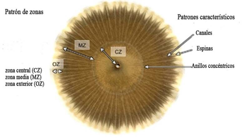 Chromatograms were also measured using the assessment proposed by Kokornaczyk et al. (2017), which uses a caliper to measure distances from the ends to the center, which consisted of three ring-shaped zones located around the central perforation (Figure 1). i) the central zone (CZ), located closest to the hole and characterized by a very light color, therefore; ii)) the darkest intermediate zone (MZ) and on the periphery of the pattern; and iii) the very light and in many cases, barely visible zone (OZ).