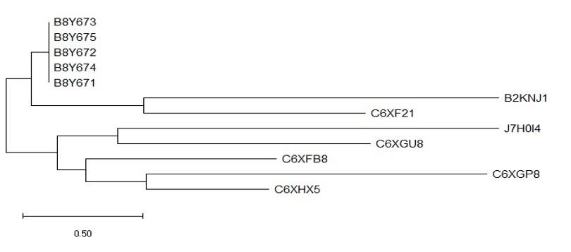Annotations of functional domains indicated predictions of surface antigen for proteins B8Y674, B8Y671, B2KNJ1, J7H0I4, B8Y672, B8Y673, B8Y675, C6XGP8, C6XGU8 and C6XFB8, suggesting that they have antigenic capacity, C6XHX5 had prediction of tolerance to organic solvents and C6XF21 maintenance of cell envelope integrity. The multiple alignment of the proteins encoded by the Omp gene (B8Y671, B8Y672, B8Y673, B8Y674 and B8Y675) showed an identity among them of 97% (Figure 1).