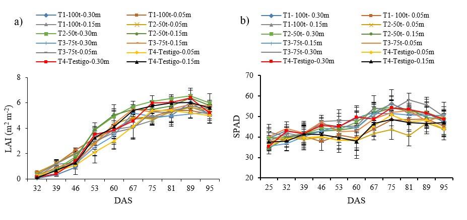 The values of LAI were affected by the treatments under study (Figure 1a), in general at the beginning it presents a slow growth, followed by a greater increase in the vegetative stage, until reaching a maximum value and then gradually decreasing due to the senescence of the leaves when the crop reaches its physiological maturity.