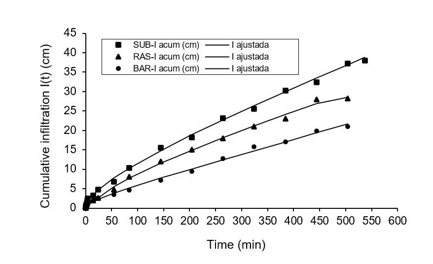 Figure 2 Average behavior of accumulated infiltration [I(t); cm], in three soil management systems: subsoiling (SUB), fallowing (BAR) and passes of harrow (RAS), in soybean-producing soils of El Soconusco, Chiapas.
