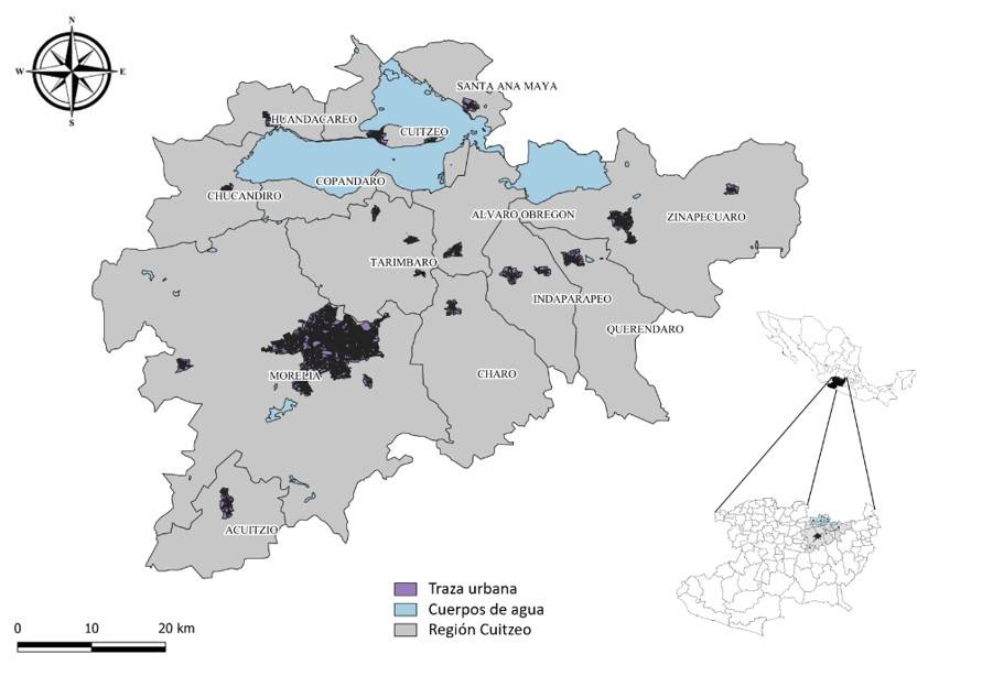 Empleando la regionalización decretada en Michoacán en 2004, de la región cuenca de Cuitzeo (RCC) es reconocida como una entidad física funcional dentro del ámbito de la administración pública y abarca 15 municipios (Indaparapeo, Morelia, Queréndaro, Santa Ana Maya, Tarímbaro, Acuitzio, Álvaro Obregón, Copándaro, Cuitzeo, Charo, Chucándiro, Huandacareo y Zinapécuaro) (CELEM, 2004) (Figura 1).