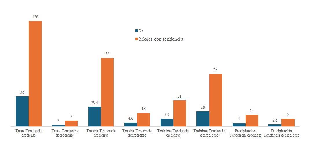 En las 18 EM se identificó alguna tendencia de CC, esto es, que los resultados muestran variación y número de meses en que ocurre dicha tendencia para temperatura máxima (Tmax), temperatura media (Tmed), temperatura mínima (Tmin) y precipitación (Precip). Hubo 12 meses para cada una de las cuatro variables mencionadas anteriormente, por lo que fueron 48 meses el máximo en los que, según este análisis, se pudo observar una tendencia de CC. La Tmax creciente fue la tendencia más frecuente 36% del total de meses, seguida de Tmed creciente con 23.4% y Tmin decreciente en 18% (Figura 2).