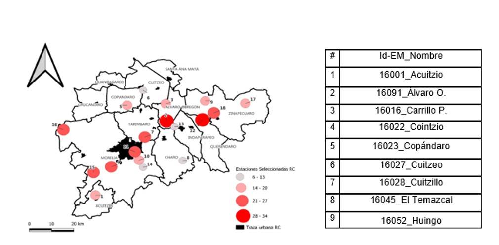 La EM 16096 ‘Presa Malpaís’ mostró la mayor tendencia con 34 meses consecutivos que muestran la señal de CC, la EM 16027 y 16114 mostraron las menores tendencias con seis meses. La Figura 3 muestra las EM seleccionadas para el estudio; así como. un gradiente de color que muestra las EM agrupadas en cuatro conjuntos según el número de meses de tendencias de CC identificadas que van desde los seis meses de tendencia. Cabe mencionar que la mayor cantidad de EM (10) presentaron tendencias entre 14 y 27 meses.