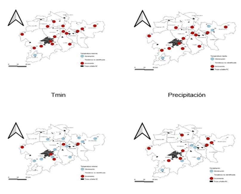 La señal de CC representa una variación, que en la referenciación geográfica no se presentan de manera unidireccional ni de forma homogénea. Los efectos de la Tmax, muestran incremento, con excepción de la EM 16001 que registró reducción de y las estaciones 16114 y 16052 no se detectó tendencia. Por su parte, en la Tmin, cinco estaciones mostraron alza de la temperatura mínima, resalta la precipitación ya que de las estaciones en las que se encontró alguna tendencia (13), en ocho de ellas, se detectaron cambios en los patrones de precipitación, con evidencia de una disminución en cinco EM, mientras que no se identificó una orientación clara en las cinco estaciones restantes.
