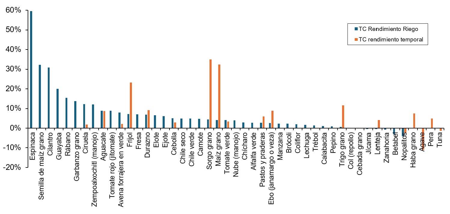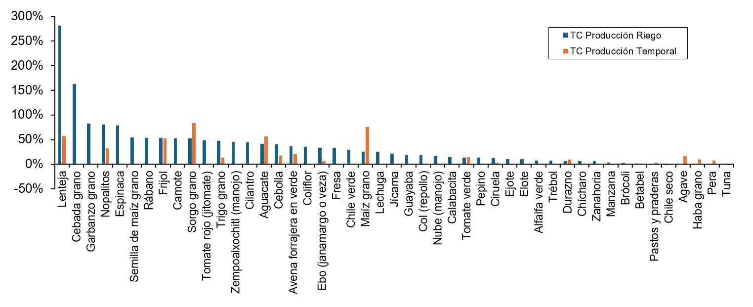 La tasa de crecimiento de la producción mostró un aumento mayor en los cultivos de riego, como la lenteja (282%) y la cebada en grano (163%). Los cultivos de temporal, con mayor tasa de crecimiento, son el sorgo grano (84%) y el maíz grano (76%). Los cultivos de riego muestran tasas superiores de crecimiento en producción y en rendimiento respecto a los de temporal (Figura 5 y 6). El efecto del CC se aprecia mayormente en los cultivos de temporal, mostró una variabilidad, medida con el coeficiente de variación (CV), que fue mayor, como se puede apreciar en el Cuadro 2.