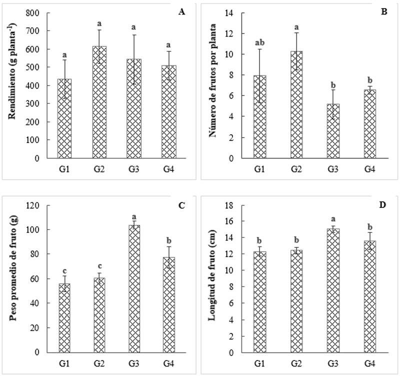 El análisis de varianza (p≤ 0.05) y prueba de medias de Tukey (p≤ 0.05), no detectó diferencias estadísticas en el rendimiento de frutos (g planta-1) en los genotipos (Figura 1A), por lo que, todos los genotipos tienen un desempeño similar bajo las condiciones de evaluación; no obstante, si se extrapola el rendimiento por planta a toneladas por hectárea, considerando la densidad de plantación de 37 000 plantas ha-1 aproximadamente, el G2 tiene rendimientos promedio de 22.69 t ha-1 y 20.06 para G3.
