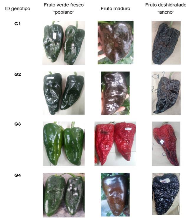 Figura 2 Frutos frescos ‘poblanos’, frutos maduros y frutos deshidratados ‘ancho’ de cuatro genotipos de chile poblano evaluados en el sureste de Coahuila.