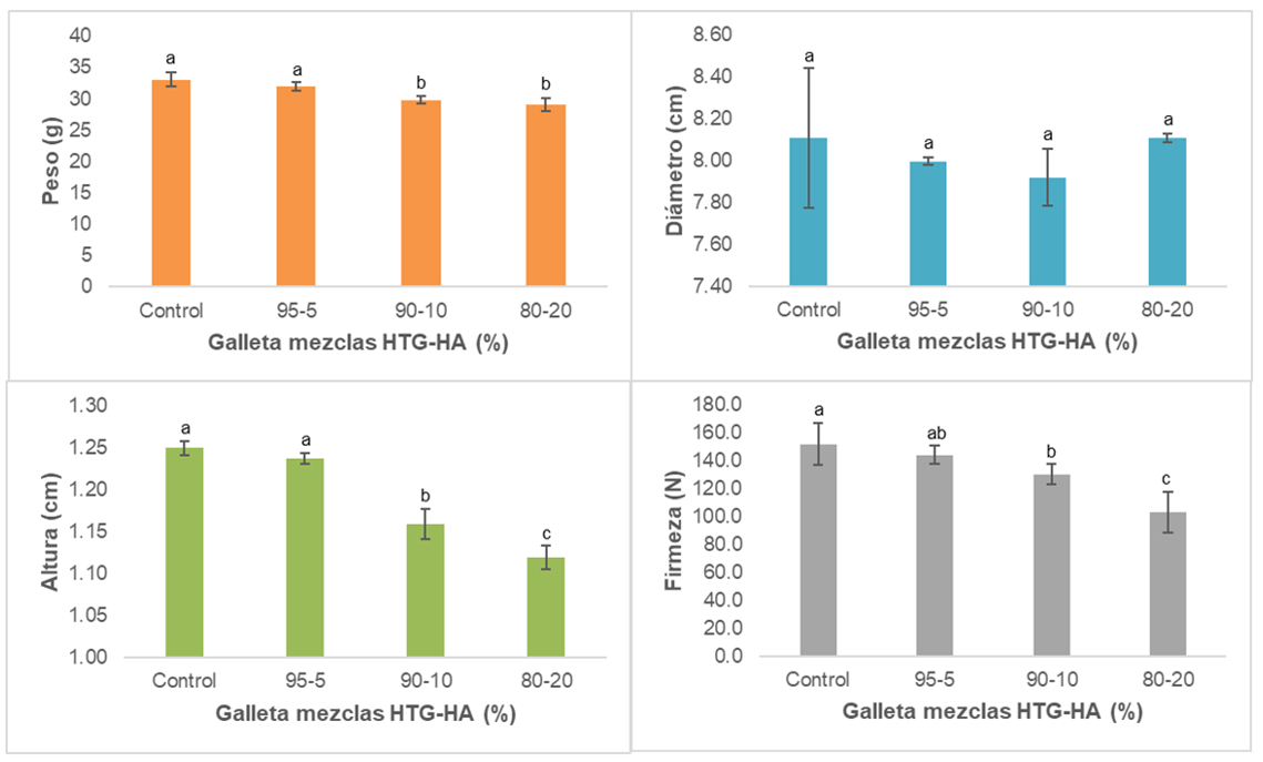 Los valores obtenidos de peso, altura, diámetro y firmeza de las galletas se muestran en la Figura 1. En lo que respecta al peso de la galleta, las sustituciones realizadas con 10 y 20% de HA mostraron diferencias significativas (p< 0.05) con respecto al control. El diámetro de la galleta no fue afectado por algún nivel de sustitución, sin embargo, la altura mostró una disminución a medida que se incrementó el porcentaje de sustitución, observándose el valor más bajo de 1.12 cm al utilizar el 20% de HA. Uno de los parámetros analizados más importantes desde el punto de vista sensorial fue la firmeza. Se observó un comportamiento similar al de la altura, a mayores niveles de sustitución de HA, la firmeza disminuyó.