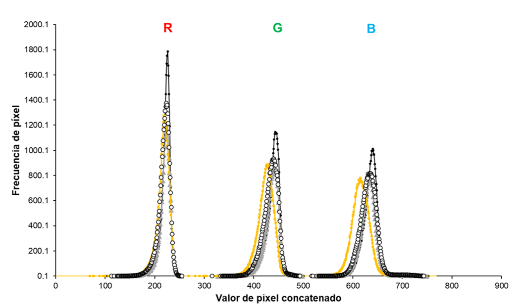 El estudio de los histogramas de frecuencia de pixel en el espacio de color RGB (rojo, azul y verde) fue aplicado para determinar patrones de cambio de color en la totalidad de la superficie de forma simultánea.
