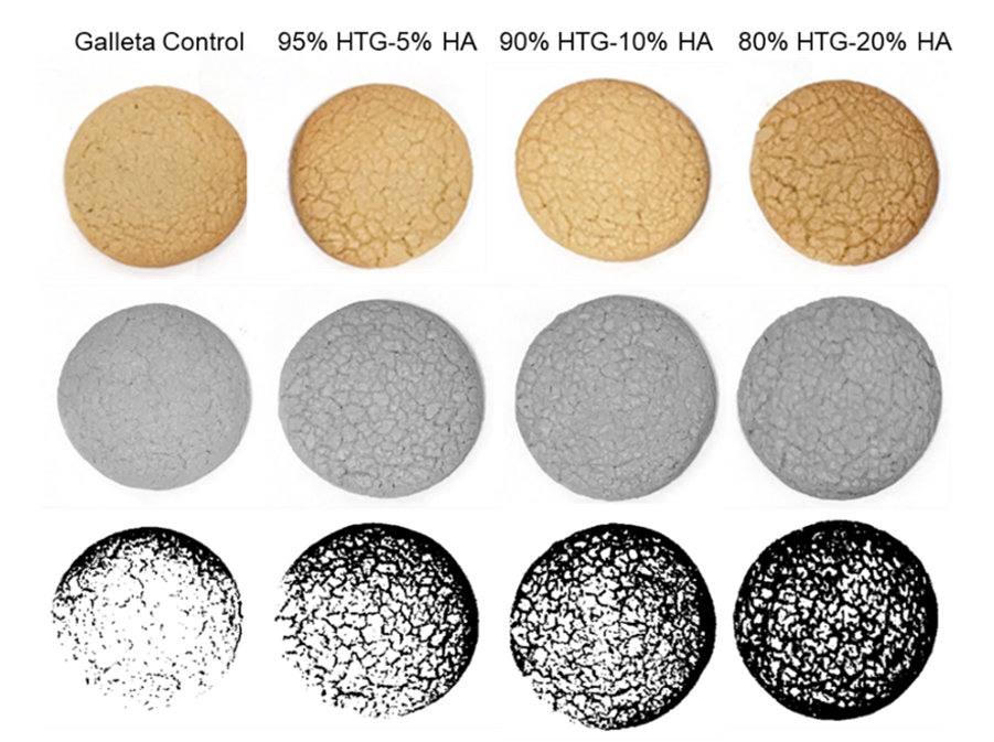 Se elaboró una galleta solo de HTG (control), además de las elaboradas con las diferentes proporciones de HTG-HA mencionadas anteriormente. Se batió manteca vegetal (64 g), azúcar (130 g), sal (2.1 g) y bicarbonato (2.5 g) por 3 min en una batidora (Modelo Artisan, KitchenAid 4.7 L, México). Se añadió dextrosa (33 g) y agua destilada (16 ml) para continuar batiendo por 2 min más, después se agregó la harina (225 g) y se mezcló por 2 min a una velocidad baja.