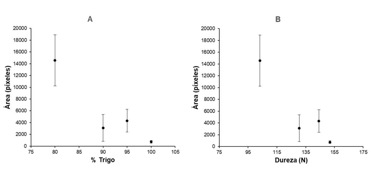 Figura 4 Correlación entre (%) de sustitución (A) y textura de la galleta (B) con el área de píxeles pertenecientes a las grietas superficiales.
