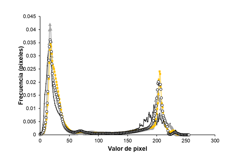 La miga de las galletas se analizó mediante histogramas en escala de grises para determinar la cantidad de píxeles pertenecientes a estructura de cereal y burbuja. En este caso, los valores tendiendo a 0 representan píxeles relacionados con espacios vacíos (oscuros), mientras que los píxeles cercanos a 255 representaron los relacionados con la estructura. Cada análisis se realizó sobre 10 muestras de galleta utilizando el software libre Fiji (Schindelin et al., 2012).