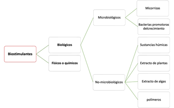 Con base a lo que mencionan Shahrajabian et al. (2021) propusieron una clasificación simple y clara que es la siguiente: bioestimulantes de origen biológico y de origen físico o químico. Dentro del primer grupo, se subclasifican en microbiológicos y no-microbiológicos, los primeros incluyen a las micorrizas y las bacterias promotoras del crecimiento vegetal, mientras que los segundos incluyen los extractos de algas y plantas terrestres, sustancias húmicas y biopolímeros como el quitosano. En la Figura 1 se representa la clasificación descrita anteriormente.