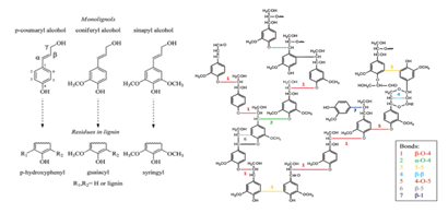 La lignina es un polímero amorfo compuesta por tres monómeros básicos; alcohol cumarílico, confierílico y sinapílico, sintetizados a partir de la ruta de los fenil propanoides, quienes respectivamente forman las unidades p-hidroxifenil (H), guayacil (G) y siringil (S). Este polímero está estructurado por la unión de estas unidades mediante enlaces éter principalmente ß-O-4, α-O-4, 5-5, ß-ß, 4-O-5, ß-5, ß-1 (Figura 2) (Maceda et al., 2021)