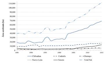 Figura 3 Comportamiento del área sembrada con nogal pecanero en los estados donde mayor producción se tiene en el periodo comprendido entre 1985 y 2015.
