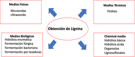 Con el fin de aprovechar y dar un valor agregado a los agroresiduos de la nuez, se han desarrollado técnicas innovadoras para la obtención de la lignina de su cáscara, como se muestra en la Figura 5, divididas en cuatro principales grupos: medios físicos, térmicos, biológicos y químicos (Olivas Tarango et al., 2019).