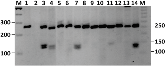 Rows 3, 4, 7 and 14 exhibit the 252, 133 and 119 bp pattern corresponding to carriers of the GDS-V associated allele in this population. Row 1= undigested PCR product; M= marker for 300, 200 and 100 bp molecular weights.