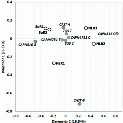 Genotype and allele frequencies were then estimated with the Cervus 3.0 program9. Using the Genepop 4.2 program10, Hardy-Weinberg equilibrium (HWE) was calculated, and genetic differentiation between the studied populations was analyzed for the four meat quality-associated markers. In the genetic differentiation analysis, the tested null hypothesis was Ho= allele distribution identical across populations. For populations, the test was done automatically by pairs of populations using contingency tables. A non-biased estimate of the P value or a Fischer exact test was run10. Graphic illustration of differentiation by allele segregation among these markers was done with a correspondence analysis in the SAS ver. 9.0 program (SAS Institute Inc., Cary, NC, USA).