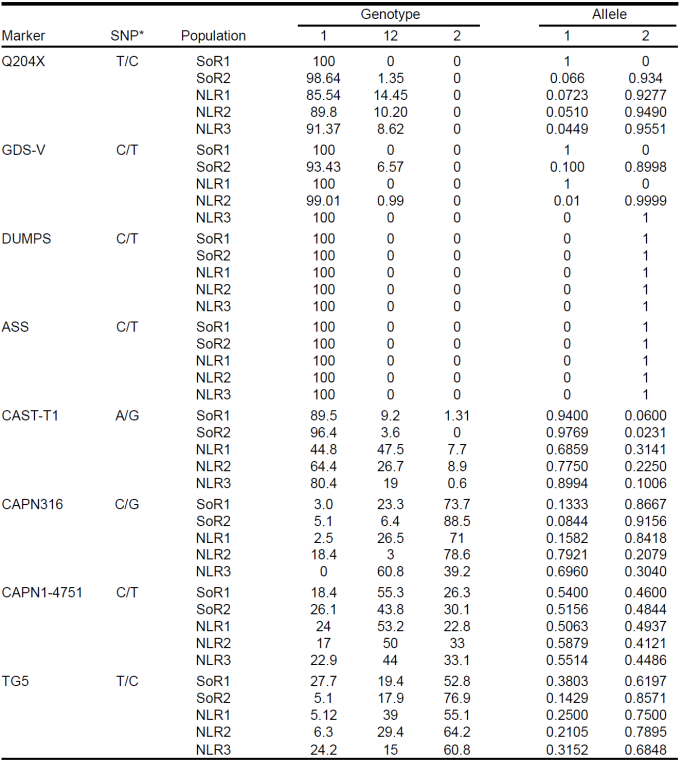 Allele segregation identified a strong influence from markers CAPN1-316 and CAST-T1 in differentiation between the northeast and northwest herds (Figure 2). It also indicated variability for the analyzed loci to be lowest among the two northwest herds.