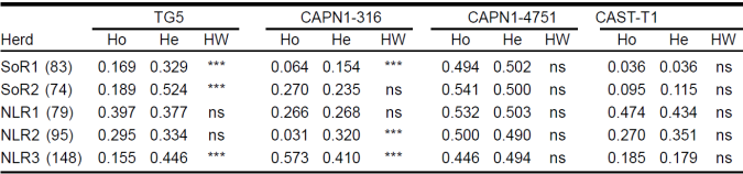 In the expected and observed heterozygosity data (Table 3), only two markers exhibited deviation in HWE. For TG5, this deviation was significant in the two northwest herds and NLR3, while for CAPN316 it was significant for SoR1, NLR2 and NLR3. All deviations were caused by a heterozygote deficit.