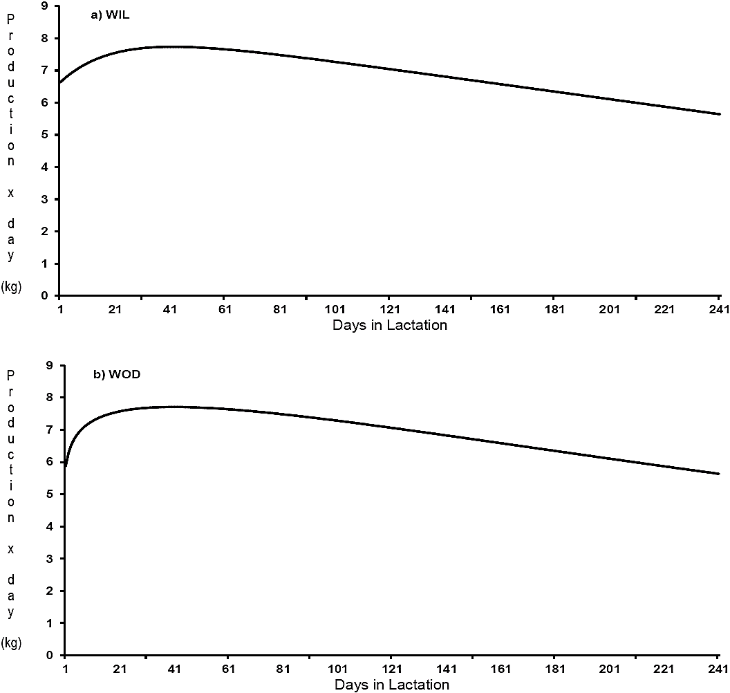 Figure 1 Siboney cattle lactation curves adjusted to 240 days based on the Wiltmink (a; WIL) and Wood (b; WOD) models