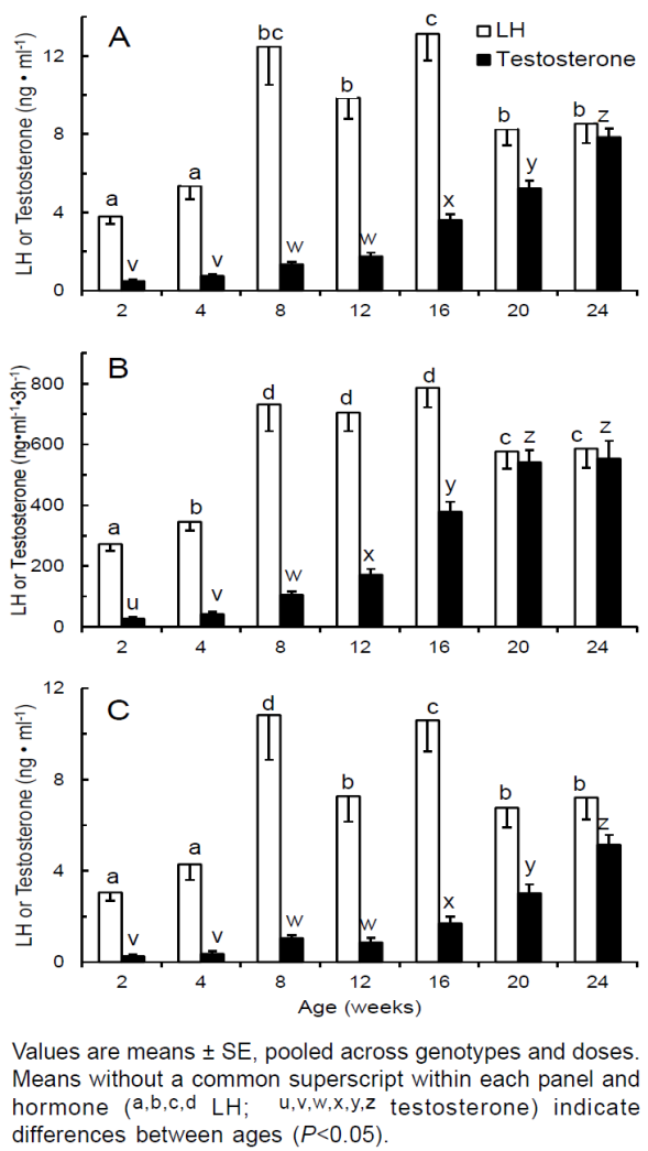 Hormone data were analyzed as a completely randomized design, using the procedure MIXED of SAS (SAS Institute Inc. Cary NC, USA) for repeated measures, with the statement “repeated”, the option sub=animal (genotype) and the autoregressive (1) covariance structure within animal. Genotype, age (and dose in study 2) and the corresponding interactions were included in the model. The endocrine variables were transformed to Logn (Y+1), so the assumptions of the analysis of variance were valid; after analysis, data were transformed back to actual values for tables and figures. Data of BW and SC were pooled across studies before the analysis, and each study was included in the model as a block. Differences were considered significant with P<0.05, and tended to be significant with P values between 0.05 and 0.1.