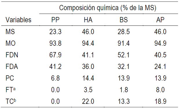 La dieta base consistió en forraje verde picado de pasto Taiwán (Pennisetum purpureum) más la inclusión 30 % de materia seca (MS) (300 g/kg de MS) como follaje de Havardia albicans, Acacia pennatula o Bursera simaruba cuya composición química se muestra en el Cuadro 1. Los tratamientos experimentales fueron pasto (PP): P. purpureum, (PPHA): P. purpureum más 30 % del follaje de Havardia albicans, (PPBS): P. purpureums 30 % Bursera simaruba o (PPAP): P. purpureum más Acacia pennatula. Las arbóreas se incluyeron como fuente de TC en la ración; adicionalmente los animales se suplementaron con sales minerales Fogysal ovino® (100 g/animal/día).